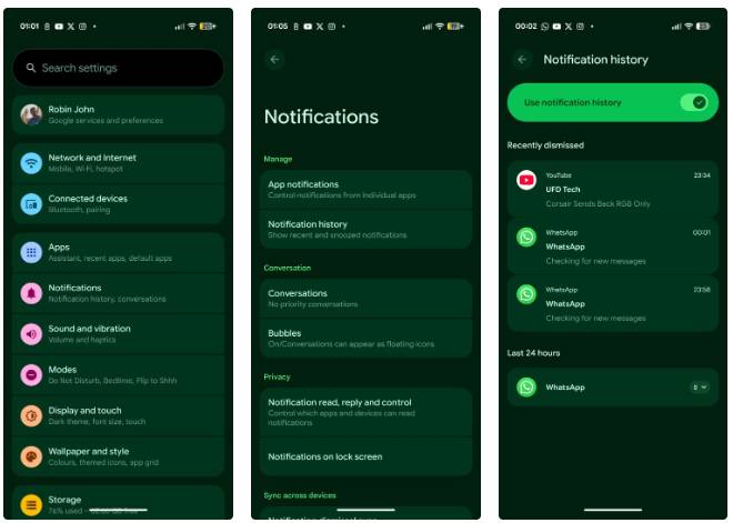 Kiểm soát thông báo trên Android không chỉ dừng lại ở việc Notification Cooldown. Bạn có thể làm được nhiều hơn thế. Nếu bạn cảm thấy mình có thể đã bỏ lỡ một thông báo nào đó trong khi điện thoại đang âm thầm giảm bớt các thông báo, Android cho phép bạn quay lại và kiểm tra lịch sử thông báo. Sau khi được bật, tính năng này sẽ hiển thị cả các thông báo gần đây và những thông báo bạn có thể đã bỏ qua hoặc tạm hoãn khi bạn không ở gần điện thoại.