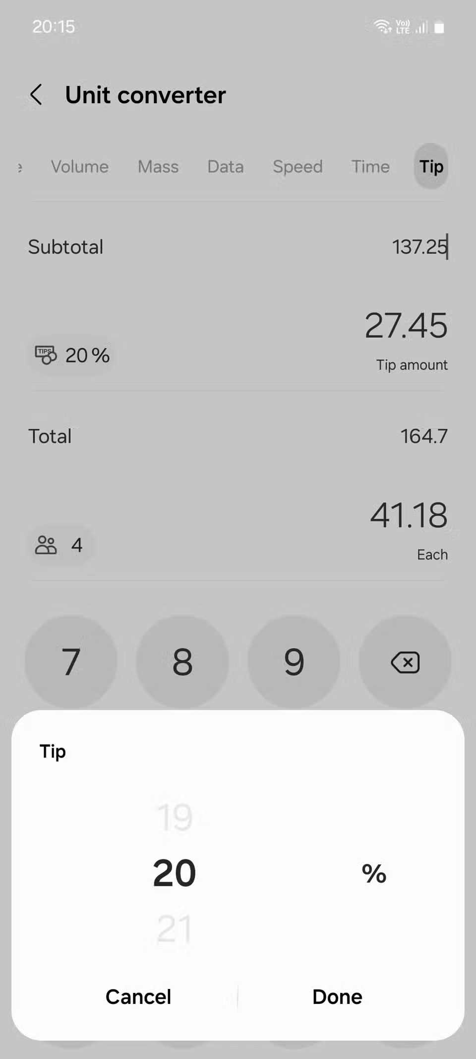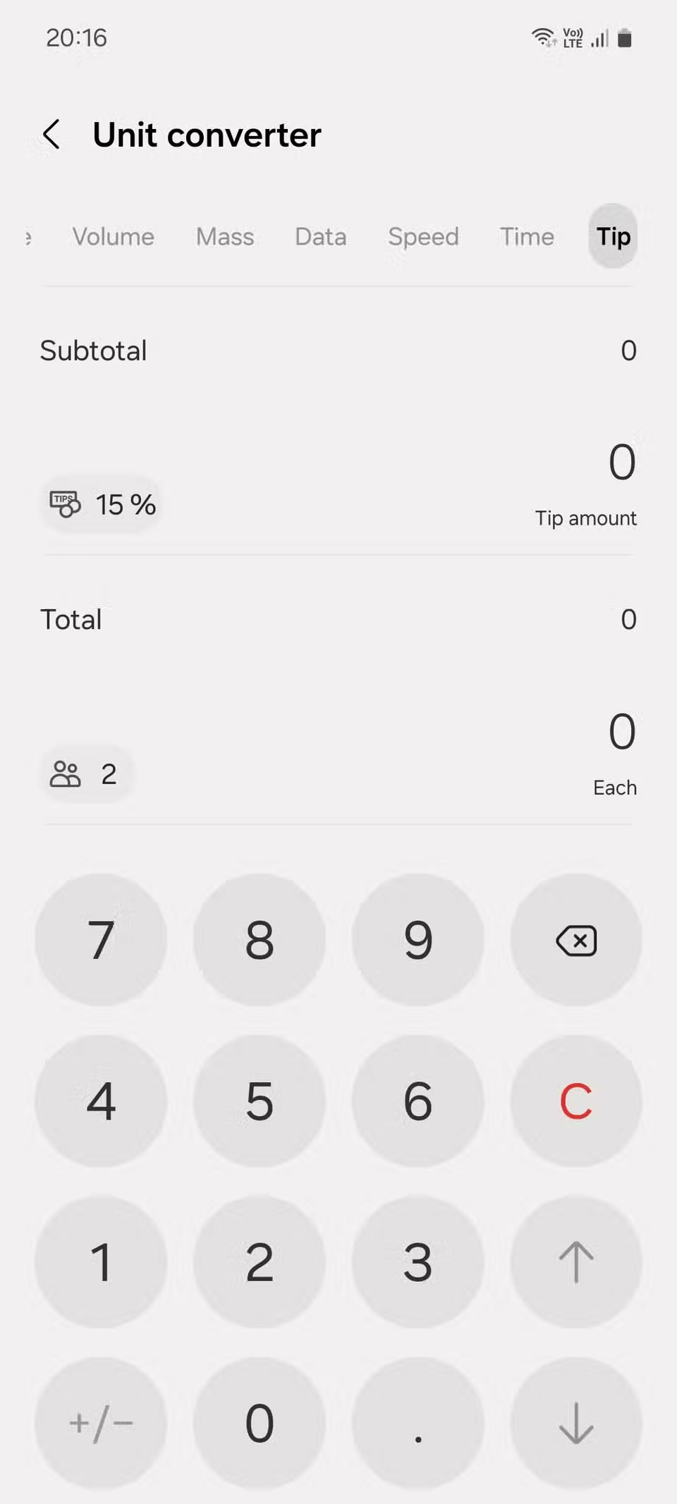 Ứng dụng máy tính trên điện thoại Samsung của bạn có công cụ tính tiền típ và chia hóa đơn với người khác. Theo cách đó, bạn không phải tự mình làm và có thể tránh được sự bối rối khi tính toán sai số tiền trong đầu.