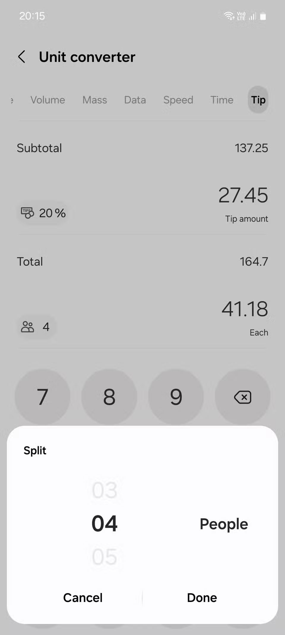 - Tiếp theo, nếu bạn chia hóa đơn với những người khác, hãy nhấn vào tùy chọn Split (biểu tượng hình người). Chọn tổng số người (bao gồm cả bạn) và nhấn vào Done. Thao tác này sẽ hiển thị số tiền mà mỗi người cần trả, sau khi tính cả tiền típ.