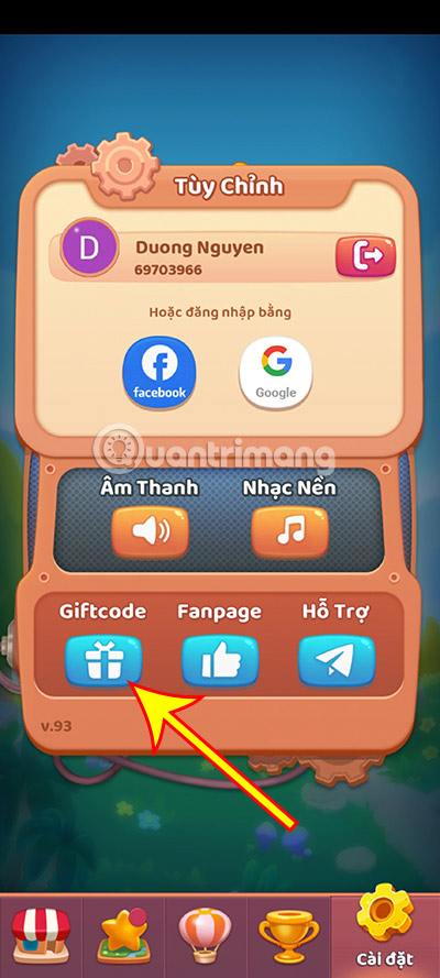 Bước 3: Ấn vào phần Giftcode trong Cài Đặt.