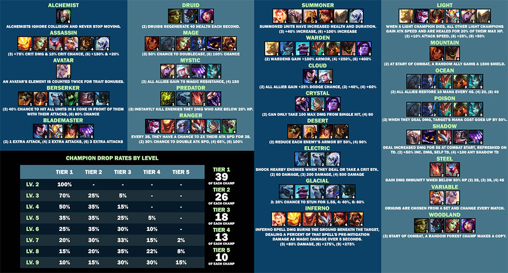 - Rừng: Khi bắt đầu vòng đấu, một tướng tộc Rừng ngẫu nhiên sẽ tạo ra thêm 1 phiên bản 1 sao của chính tướng đó nếu đủ 3 Woodland).