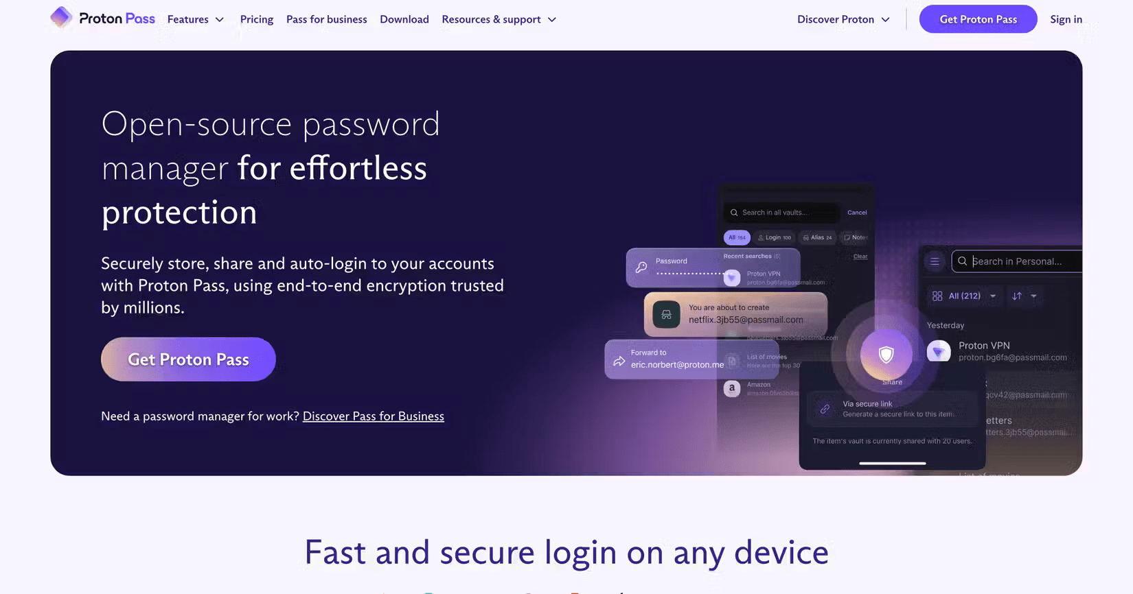 Proton Pass cũng bao gồm tính năng giám sát dark web, bảng điều khiển trung tâm để quản lý người dùng, đồng bộ thiết bị không giới hạn, thư mục chia sẻ không giới hạn, dung lượng lưu trữ file 3TB, xác thực hai yếu tố (2FA) bằng mật mã, hỗ trợ ưu tiên, tính năng ẩn email và chia sẻ thông tin đăng nhập an toàn.