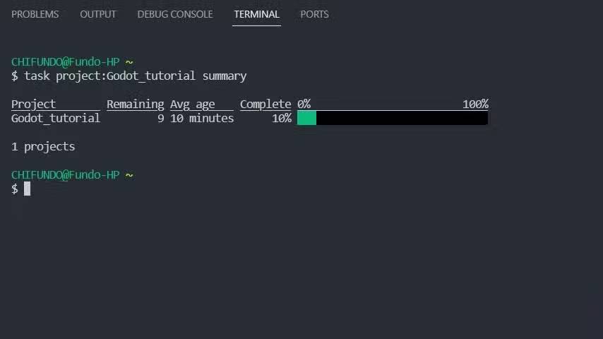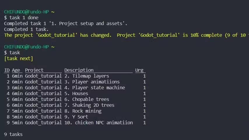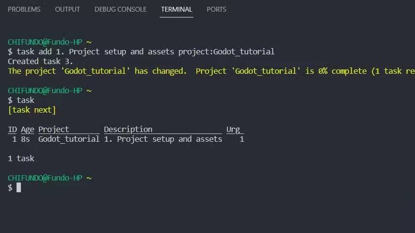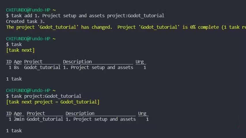 task add 1. Project setup and downloading assets project:Godot_tutorialBạn có thể xem tất cả các nhiệm vụ trong một dự án bằng lệnh sau: