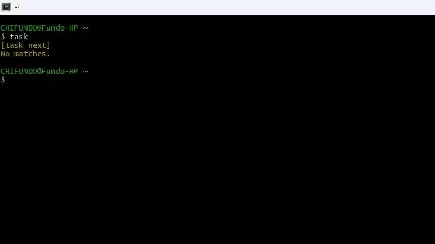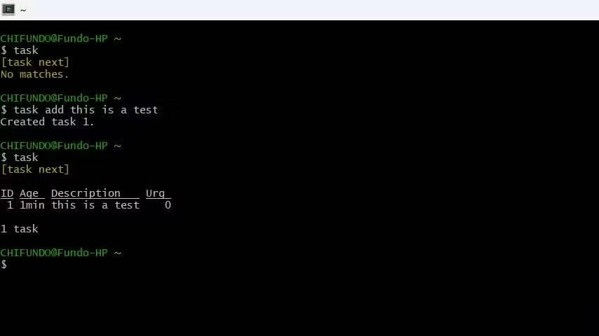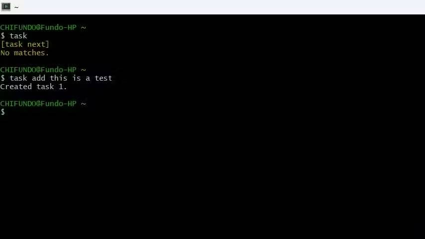 Chạy lại lệnh `task` sẽ không hiển thị gì vì không có tác vụ nào để liệt kê. Vì vậy, hãy thêm một tác vụ bằng lệnh sau: