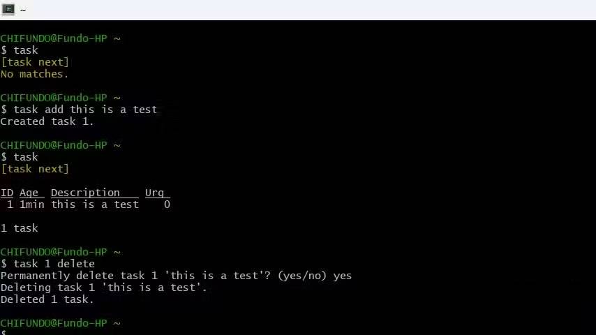 task add this is a testBạn có thể thấy tác vụ trong Taskwarrior và xác minh rằng nó hoạt động như mong đợi. Hãy xóa nó bằng ID với lệnh bên dưới.