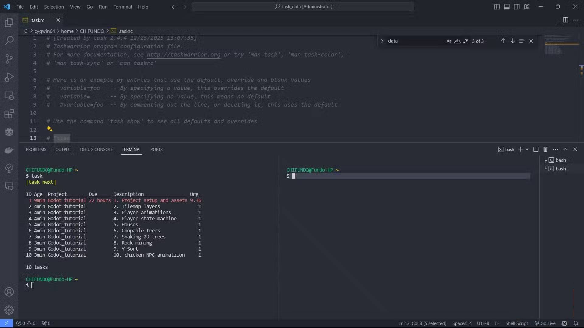 task 1 deleteTiếp theo, hãy sử dụng Cygwin trong VS Code. May mắn thay, VS Code tự động phát hiện cài đặt Cygwin và có thể khởi chạy terminal bên trong nó. Mọi người chuyển sang VS Code vì nó cho phép bạn, ví dụ, chia bảng điều khiển terminal để có thể xem danh sách tác vụ của mình trong một khung và quản lý các tác vụ của mình trong khung khác. Bạn thậm chí có thể mở file cấu hình Taskwarrior để điều chỉnh các cài đặt - tất cả ở cùng một vị trí.