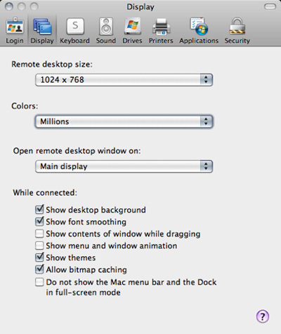 Nhưng nếu bạn gặp trường hợp điền đúng tên máy tính nhưng vẫn không thực hiện được kết nối, hãy thay vào đó là địa chỉ IP để giải quyết vấn đề. Nếu muốn lưu thông tin cho những lần đăng nhập tiếp theo thì chọn mục Add user information to your keychain, và Reconnect automatically if disconnected để hệ thống tự động kết nối lại khi bị ngắt giữa chừng. Tại thẻ Display, người sử dụng có thể tùy chỉnh một số thông tin khác như chế độ màu, kích thước màn hình... hãy tắt bớt những hiệu ứng không cần thiết để tăng tốc độ truyền tải dữ liệu và hiệu suất hoạt động, ví dụ như ảnh nền, theme, chuyển menu windows về chế độ Basic... ví dụ như sau: