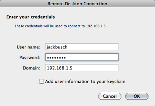 Từ bây giờ, mỗi khi bạn khởi động Remote Desktop Connection cho Mac, chương trình sẽ tự động tải file .rdp cũ. Còn nếu muốn tạo 1 kết nối mới, thì chỉ cần điền tên máy tính khác vào ô Computer và nhấn Connect: