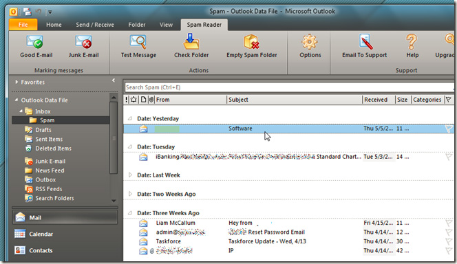 Trước tiên, các bạn hãy truy cập vào đây, tải và cài đặt phiên bản mới nhất. Khi khởi động, chương trình sẽ hiển thị thêm 1 tab mới Spam Reader trên giao diện chính. Và khi mở Outlook, ứng dụng sẽ tự động tiến hành quá trình phân tích mục Inbox để tìm các tin nhắn spam, đồng thời hiển thị cảnh báo về kết quả tìm được ở phía dưới khay hệ thống:
