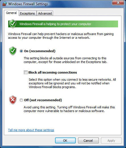 Thông thường, để cấu hình tường lửa Windows Vista, bạn chọn Control Panel, sau đó Security, bật hoặc tắt Windows Firewall. Bạn sẽ nhìn thấy màn hình hiển thị như hình dưới đây.