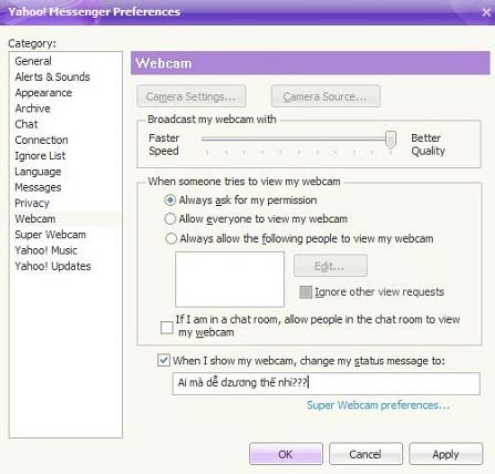 Với chức năng thay đổi status khi mở webcam, thay vì những câu status như "View my webcam" hay "Xem webcam của tôi", bạn hoàn toàn có thể thay đổi những dòng chữ này cho bớt nhàm chán.