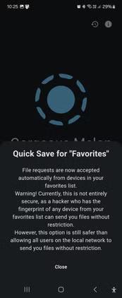 LocalSend có giao diện người dùng đơn giản, nơi bạn có thể chọn gửi hoặc nhận file từ thiết bị gần đó. Với Quick Save, bạn cấu hình ứng dụng để tự động chấp nhận file từ tất cả các thiết bị trên mạng cục bộ hoặc chỉ những thiết bị được đặt làm mục yêu thích. Một tính năng tiện dụng khác là khả năng chia sẻ file APK với bạn bè và gia đình để bỏ qua quá trình tải xuống.