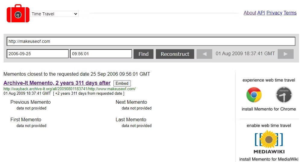 Đóng vai trò như một công cụ tổng hợp các kho lưu trữ web, Memento Time Travel cho phép bạn du hành ngược dòng ký ức và xem những trang web cũ. Memento yêu cầu bạn nhập bất kỳ URL nào và thời gian trong quá khứ.
