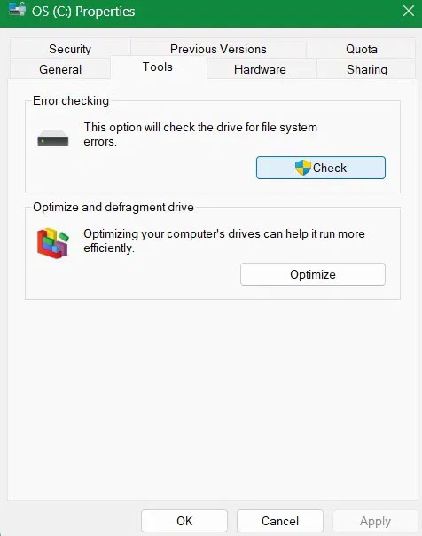 Nhấp chuột phải vào ổ C, mở Properties và chuyển đến tab Tools. Nhấp vào Check trong mục Error checking.