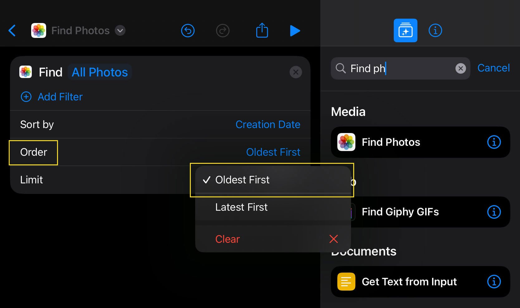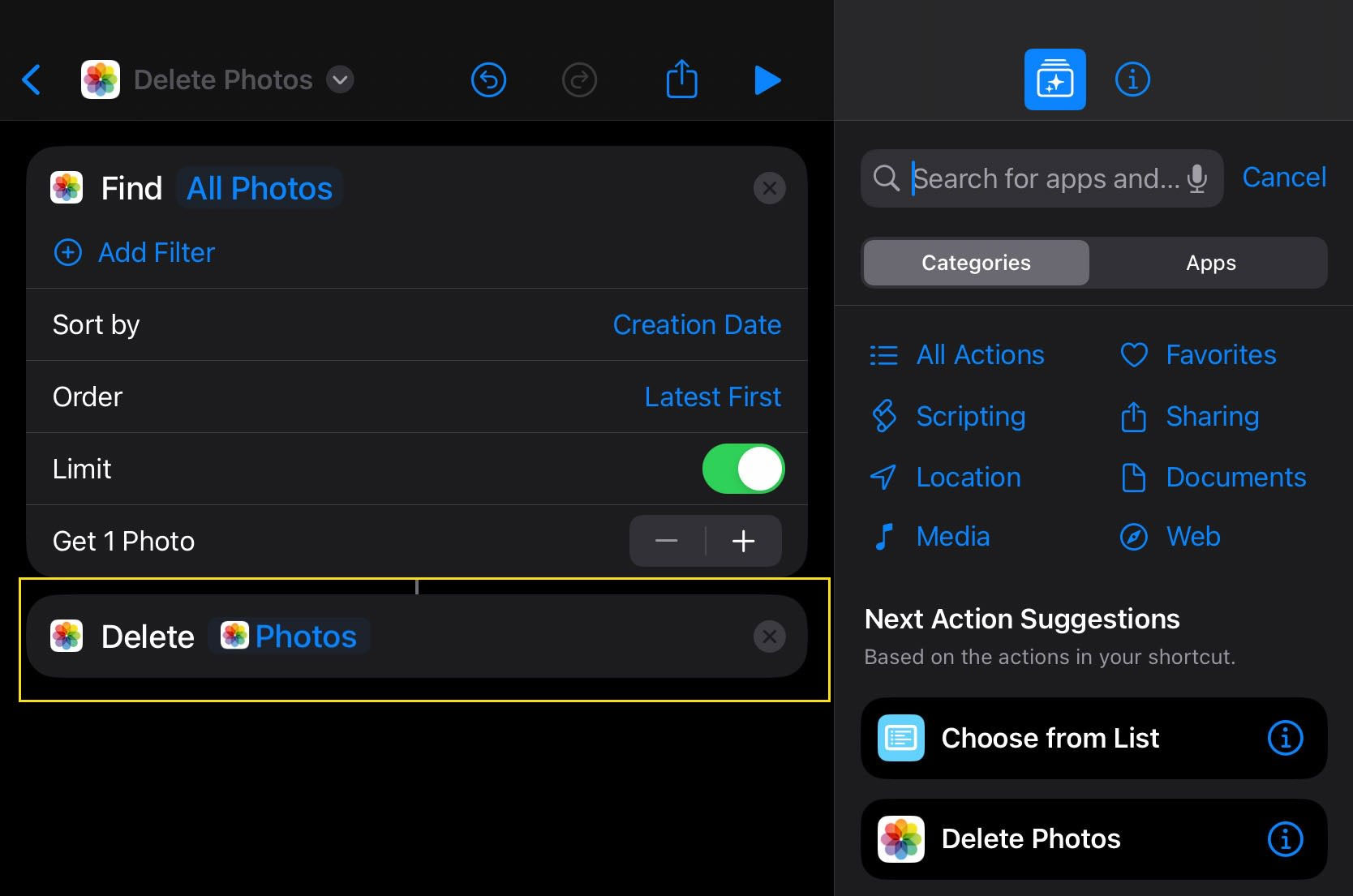Shortcut này bây giờ sẽ tìm kiếm ảnh mới nhất trong thư viện ảnh của bạn để xóa.