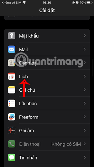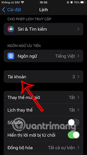 Trong Cài đặt trên iPhone bạn nhấn vào ứng dụng Lịch rồi chọn tiếp vào mục Tài khoản để điều chỉnh.
