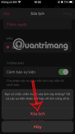 Muốn xóa lịch trong ứng dụng, bạn nhấn vào biểu tượng chữ i tại Lịch rồi chọn Xóa lịch. Tiếp tục nhấn Xóa lịch để thực hiện thao tác.