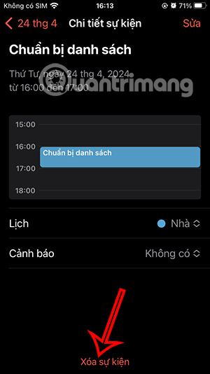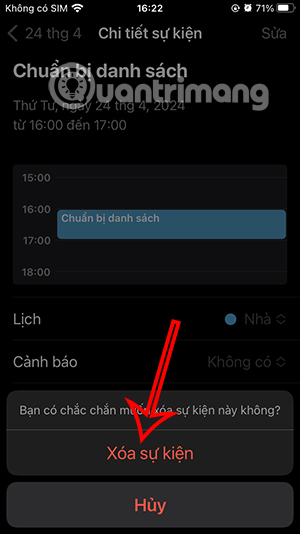 Để xóa sự kiện thì bạn chỉ cần nhấn vào sự kiện rồi chọn Xóa sự kiện ở bên dưới. Cuối cùng nhấn Xóa sự kiện để thực hiện xóa sự kiện đã tạo trong ứng dụng Lịch trên iPhone.