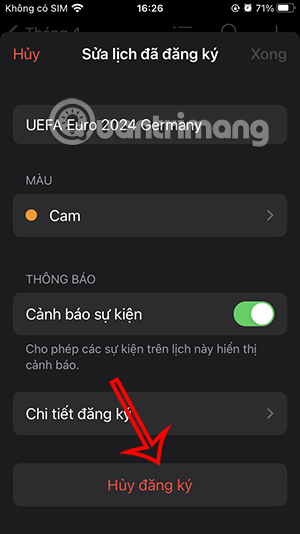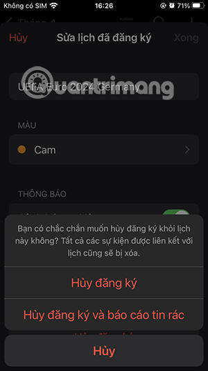 Ngoài ra bạn cũng có thể hủy đăng ký lịch trong ứng dụng. Nếu lịch đó spam nội dung thì có thể chọn Hủy đăng ký và báo cáo tin rác.