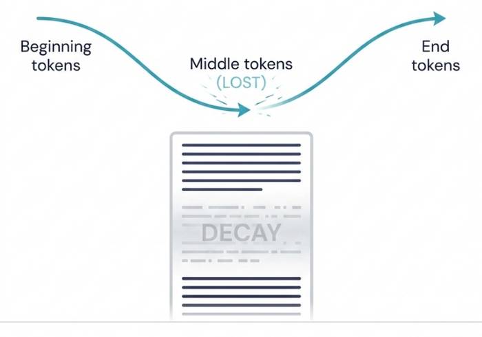 - Veseli et al (2025) nhận thấy rằng mô hình hình chữ U (trong đó LLM ưu tiên các token ở đầu và cuối) mà Liu et al (2023) tìm thấy chỉ tồn tại khi ngữ cảnh chưa đầy 50%. Khi ngữ cảnh đầy hơn 50%, Veseli et al (2025) đã tìm thấy một mô hình khác: Ngữ cảnh bị suy giảm theo khoảng cách từ cuối, trong đó LLM ưu tiên các token gần đây hơn, sau đó là những token ở giữa, so với các token ban đầu.