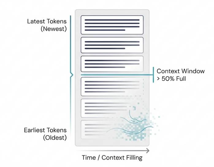 - Khi cửa sổ ngữ cảnh được lấp đầy trên 50%, mô hình sẽ mất các token đầu tiên.