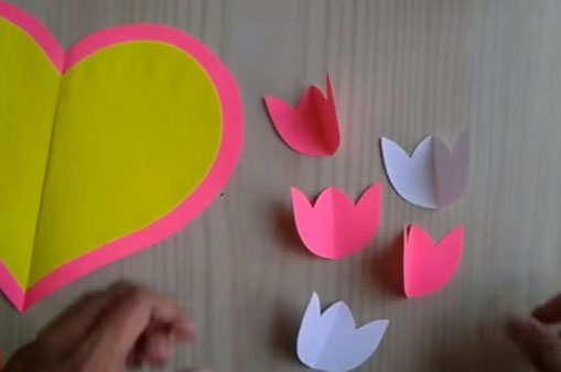 - Lấy một tờ giấy màu hồng, gấp một phần giấy lại thành đường thẳng rồi vẽ hình bông hoa tulip. Dùng kéo cắt bông hoa ra. Cắt vài bông hoa như vậy với các màu sắc khác nhau.