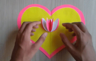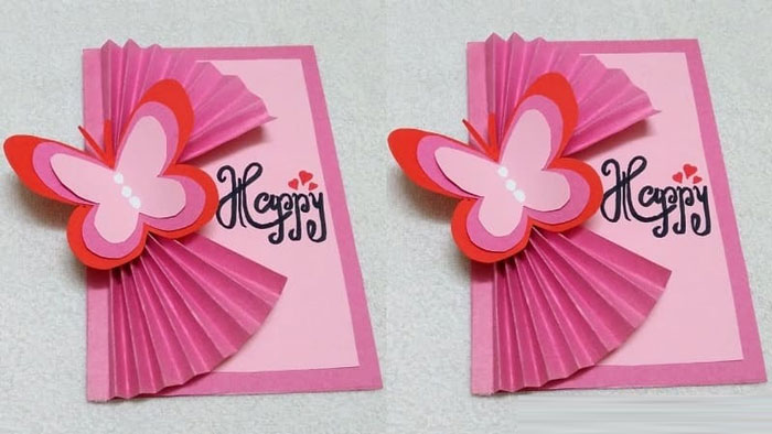 - Bước 4: Sử dụng một tờ giấy màu hồng khác gấp lại thành hình cánh quạt. Sau đó dán cánh quạt lên mép thiệp và cố định cánh quạt bằng băng dính hai mặt hoặc keo.