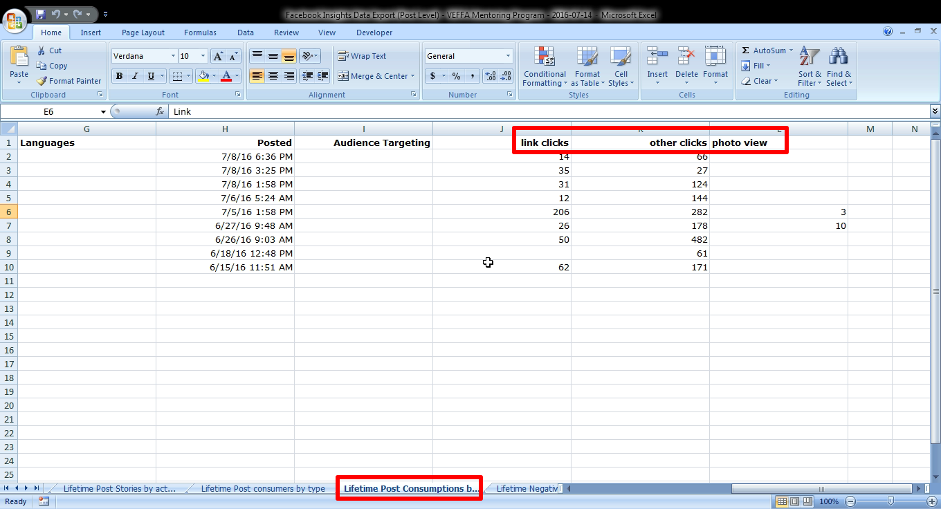 Bạn sẽ không thấy tỉ lệ này trên giao diện Facebook mà phải tìm trong file Excel. Tab mang tên Lifetime Post Consumers by Type sẽ đưa đến số lượng người click vào bất kì nơi nào trên bài đăng của bạn. Tab bên phải sẽ mang đến số lượng click vào bất kì nơi nào trên bài đăng. Mỗi bài đăng đều được phân loại Link, Photo hay Video.