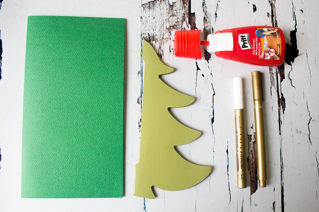 Đầu tiên bạn gấp đôi miếng giấy bìa mầu xanh để làm thiệp, tiếp đó dán 2 mép cây thông vào mặt trong chiếc thiệp. Sau khi đã dán xong bạn dùng tay miết để keo dính chặt, và đợi cho keo khô