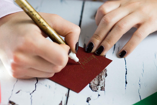 Bạn dùng bút nhũ bạc hoặc nhũ vàng viết những lời chúc ý nghĩa lên tấm thiệp Giáng Sinh.