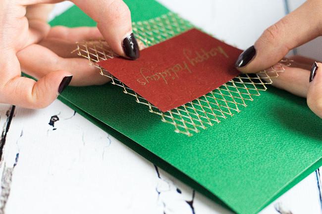Cuối cùng bạn dán tấm giấy bìa có ghi lời chúc lên miếng lưới và dán lên mặt ngoài tấm thiệp là đã hoàn thiện tấm thiệp rồi đó