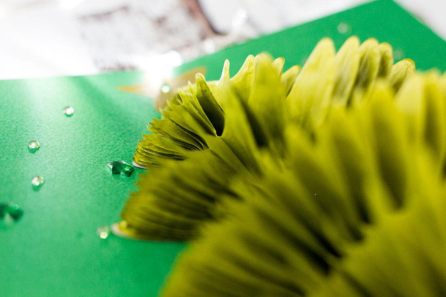 Tiếp đó bạn đính những hạt cườm hình sao và hình tròn nhỏ vào các góc của tấm thiệp. Những hạt cườm này sẽ giúp tấm thiệp của bạn độc đáo hơn nhiều đó.