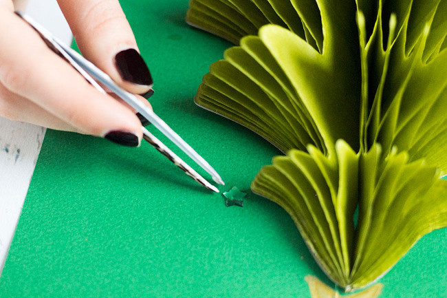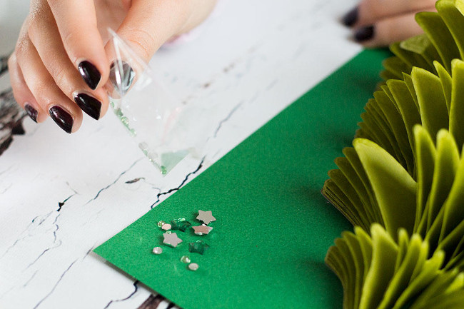 Ở mỗi tầng lá của cây thông, bạn cũng đính một hạt đá hình sao hoặc hình tròn vào đó. Nên sử dụng nhíp sẽ đính dễ dàng hơn bạn nhé!