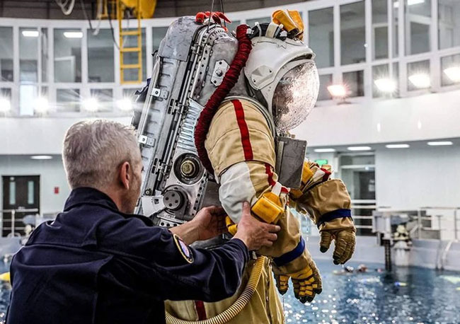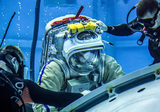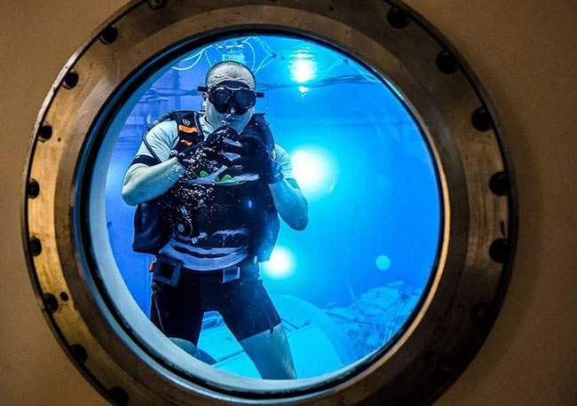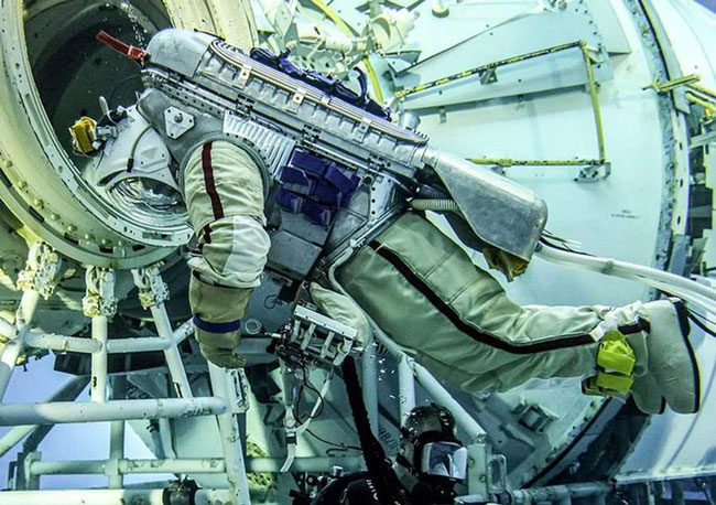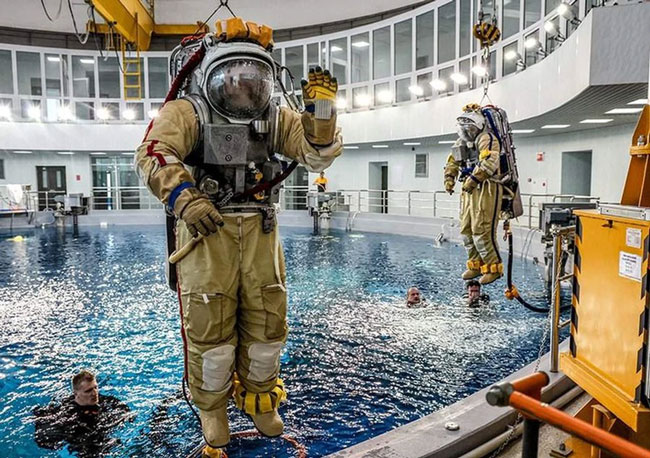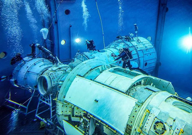Để mô phỏng tình trạng không trọng lượng trong các chuyến đi bộ ngoài không gian, mô hình bộ phận của Nga trong trạm Vũ trụ Quốc tế (ISS) được đặt trong một phòng thí nghiệm dưới nước đặc biệt ở Star City, bên ngoài Moscow, Nga.