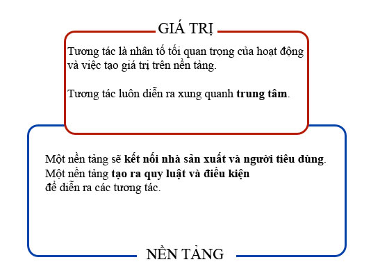 Quay trở lại với nền tảng, mỗi nền tảng đều hỗ trợ cho mối tương tác giữa nhà sản xuất và người tiêu dùng. Các mối tương tác này luôn diễn ra xung quanh 1 trung tâm, giống như quả bóng nói trên. Cũng như luật trong các trò chơi và vai trò của trọng tài, mục đích của nền tảng là cung cấp các điều kiện cần thiết để những mối tương tác diễn ra hiệu quả.