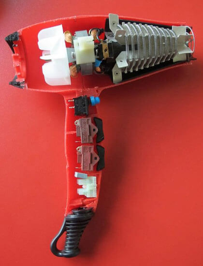Một máy sấy tóc sẽ gồm dây điện trở (hay dây đốt vonfram), quạt gió, công tắc, rơ le nhiệt và bộ phận cửa đón gió.