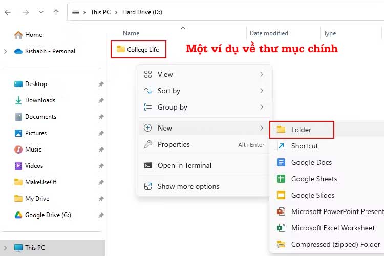 - Đi sâu vào trong thư mục bạn vừa tạo. Giờ hãy tạo 4 thư mục khác nhau để sắp xếp cấu trúc thư mục. Chúng ta sẽ dùng phương pháp tiếp cận PARA để đặt tên cho thư mục. PARA là chữ viết tắt của Projects - Dự án, Areas - Môn học, Resources - Tư liệu, và Archives - Lưu trữ các thư mục đã hoàn thành hoặc cũ để tham khảo trong tương lai.