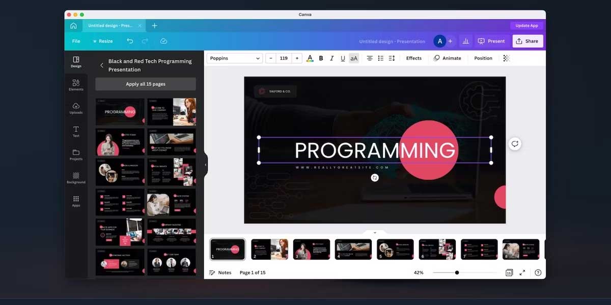 Dù không thể tùy biến như PowerPoint nhưng Canva có nhiều tính năng cải tiến. Ví dụ, bạn có thể mang các nhân tố thiết kế hiện đại và ảnh stock vào slide chỉ bằng một click. Tương tự, bạn có thể dùng các asset thiết kế từ những dự án trước trên Canva. Bạn cũng có lựa chọn xuất bài thuyết trình sang các định dạng như PDF, PNG và MP4.