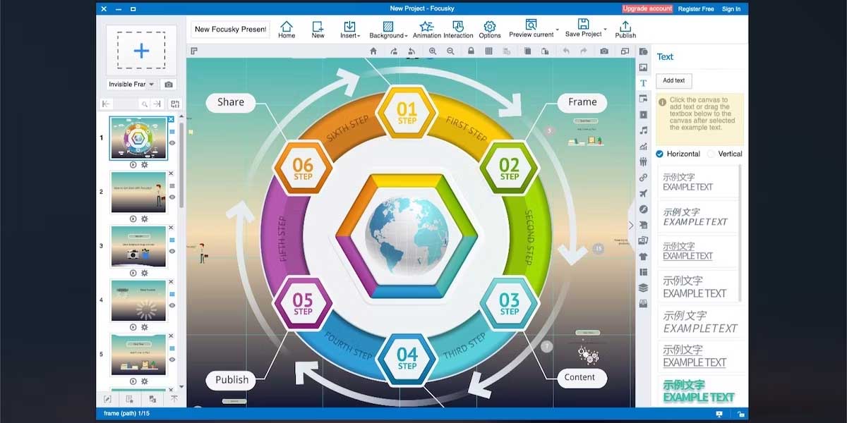 Focusky được thiết kế nhằm giúp người dùng tạo bài thuyết trình slideshow dạng HTML5. Nó hoạt động tốt trên web. Hầu hết các tính năng cốt lõi của nó đều được căn chỉnh bằng cách giúp bạn xây dựng bài thuyết trình sáng tạo. Bạn dễ dàng tìm thấy những nhân tố phổ biến như lưu đồ, đồ thị và biểu đồ.