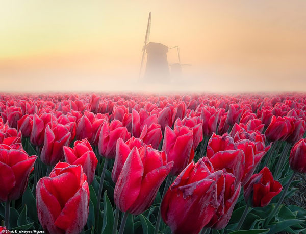 Hà Lan tuyệt đẹp với hoa tulip, sương mù và chiếc cối xay gió trong bức ảnh chụp của Nick de Jonge.