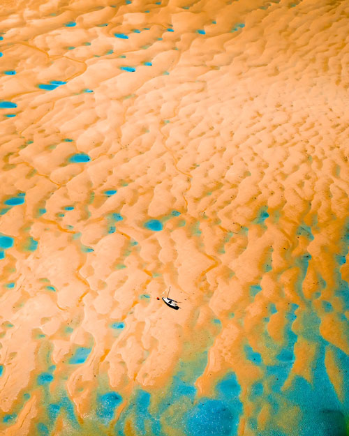 Matthew Perks đã phải chờ đợi 3 tiếng để thủy triều rút đi và sử dụng một máy bay không người lái để chụp cảnh chiếc thuyền này ở Padstow, Anh.