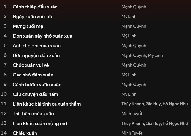 Nhạc xuân năm nay có sự lên ngôi của những ca khúc nào trên Spotify? Nếu muốn biết câu trả lời, dưới đây là top nhạc xuân hay và được nghe nhiều nhất trên Spotify hiện tại.