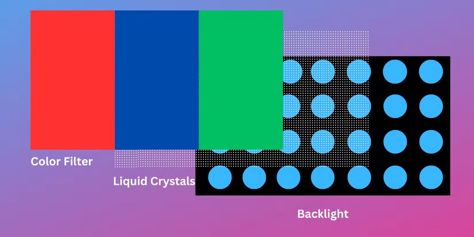 Như hình ảnh trên cho thấy, màn hình LCD thông thường có ba lớp chính: Đèn nền, tấm nền tinh thể lỏng và bộ lọc màu. Màn hình sử dụng đèn nền làm nguồn sáng. Ánh sáng sau đó được làm mờ và xử lý bởi tấm nền tinh thể lỏng để tạo ra hình ảnh thang độ xám. Hình ảnh thang độ xám này sau đó đi qua lớp lọc màu, tạo ra hình ảnh màu cuối cùng mà bạn nhìn thấy trên màn hình.