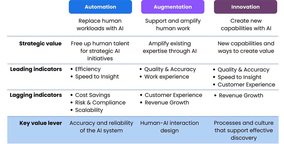 Giá trị của AI thường xuất hiện theo ba hướng chính: tự động hóa, tăng cường và đổi mới.