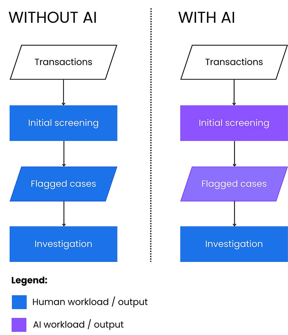 Trong kịch bản tự động hóa, AI đảm nhận các tác vụ lặp lại và xử lý với mức can thiệp của con người thấp nhất. Ví dụ điển hình là phát hiện gian lận trong giao dịch ngân hàng. AI có thể phân tích hàng triệu giao dịch theo thời gian thực, tự động xử lý phần lớn trường hợp, chỉ chuyển những tình huống phức tạp cho chuyên gia.