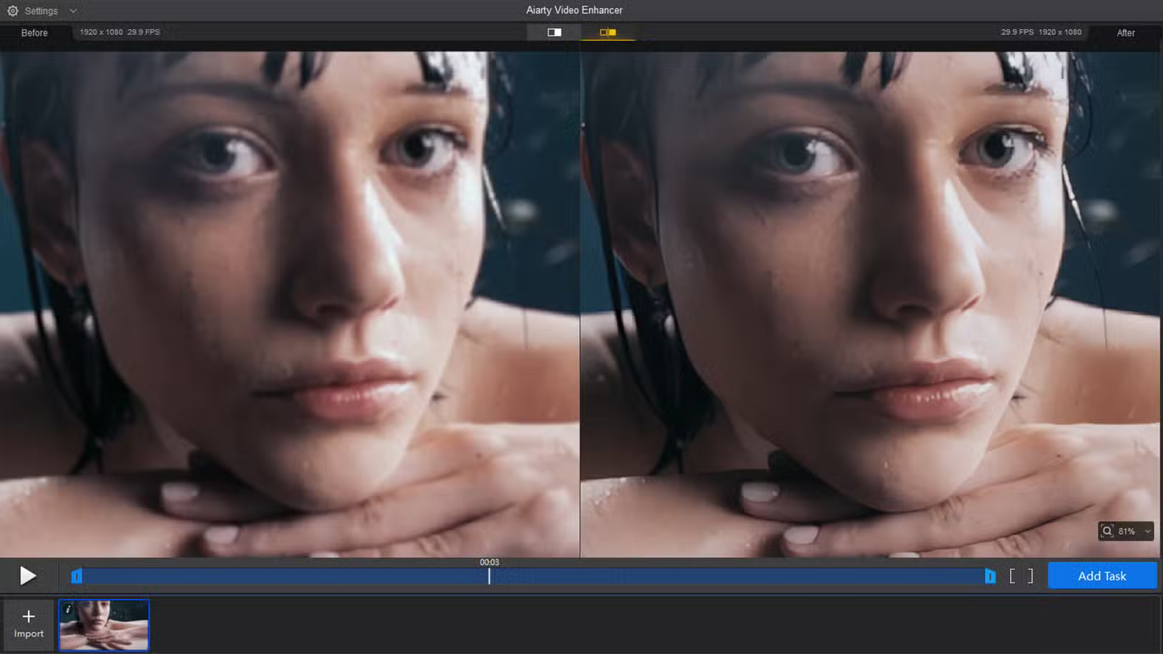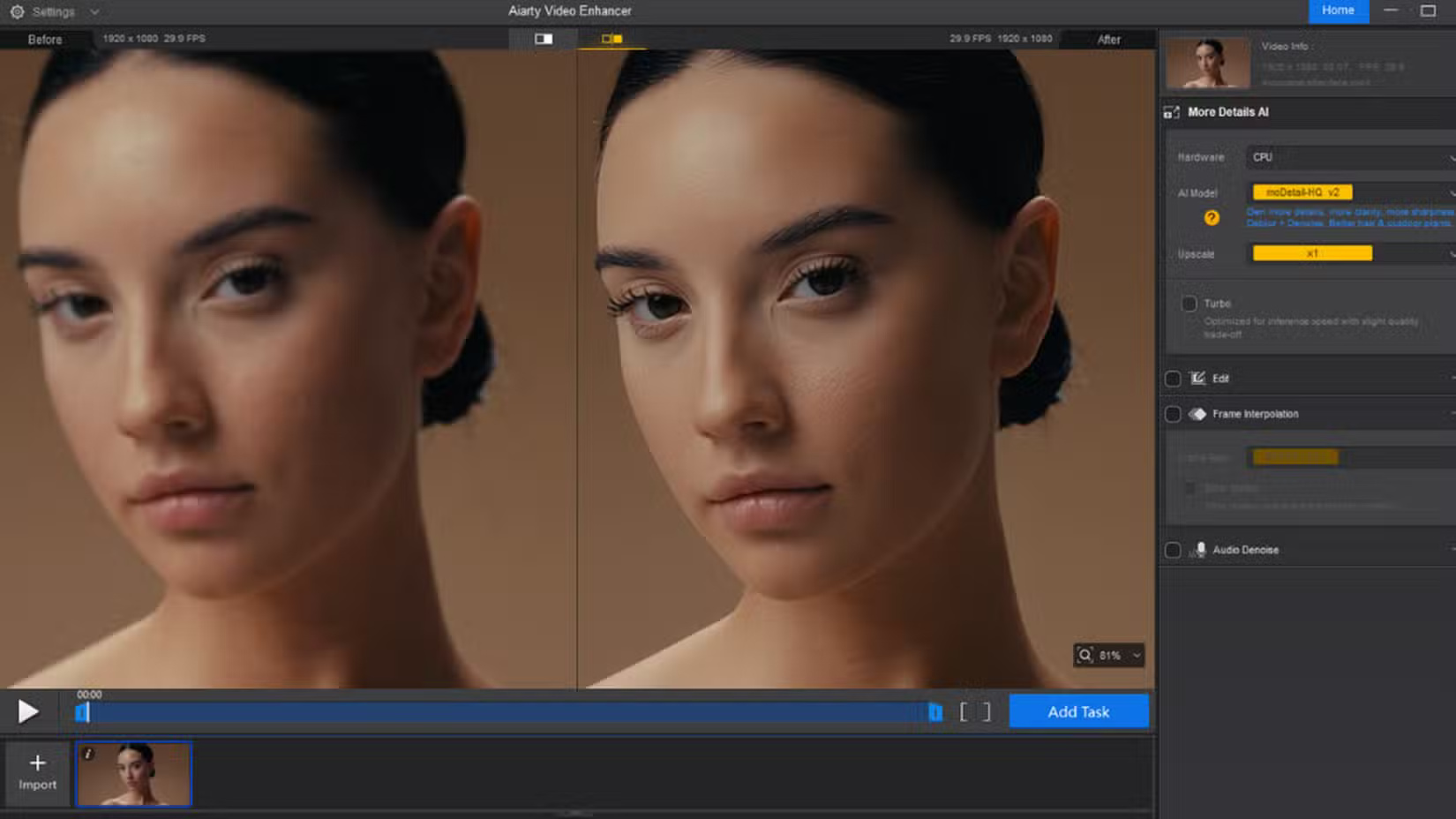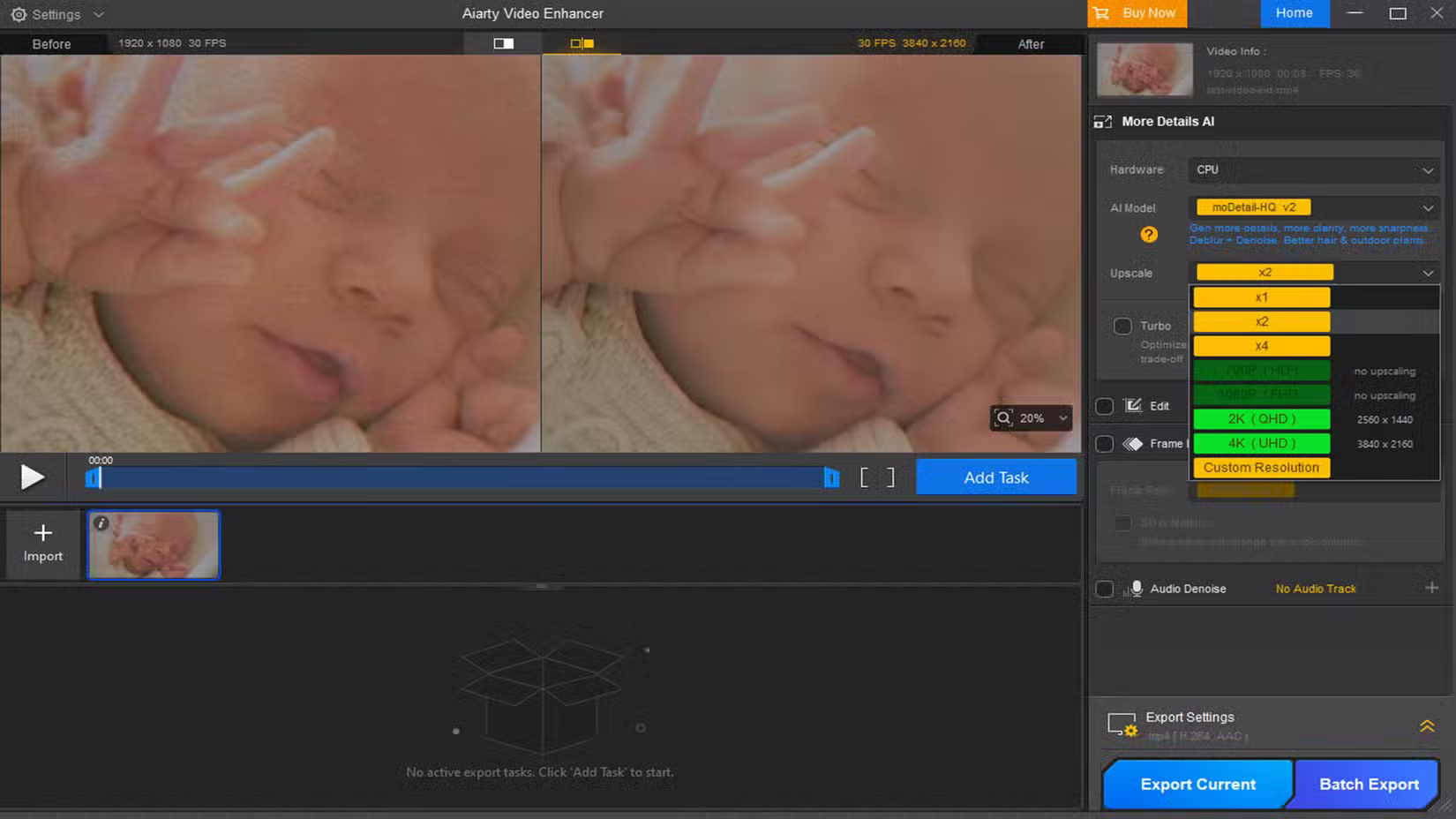 Màn hình ngày nay ngày càng lớn và sắc nét hơn, nhưng nhiều video cũ không bao giờ được thiết kế để phát ở độ phân giải 1080p hoặc 4K. Chỉ cần phóng to video có độ phân giải nhỏ sẽ khiến các lỗi trở nên lớn hơn. Tính năng nâng cấp của Aiarty không chỉ kéo dài pixel; nó còn thêm chi tiết một cách thông minh, làm mịn các cạnh và khôi phục những đặc điểm để phiên bản được nâng cấp trông chân thực.