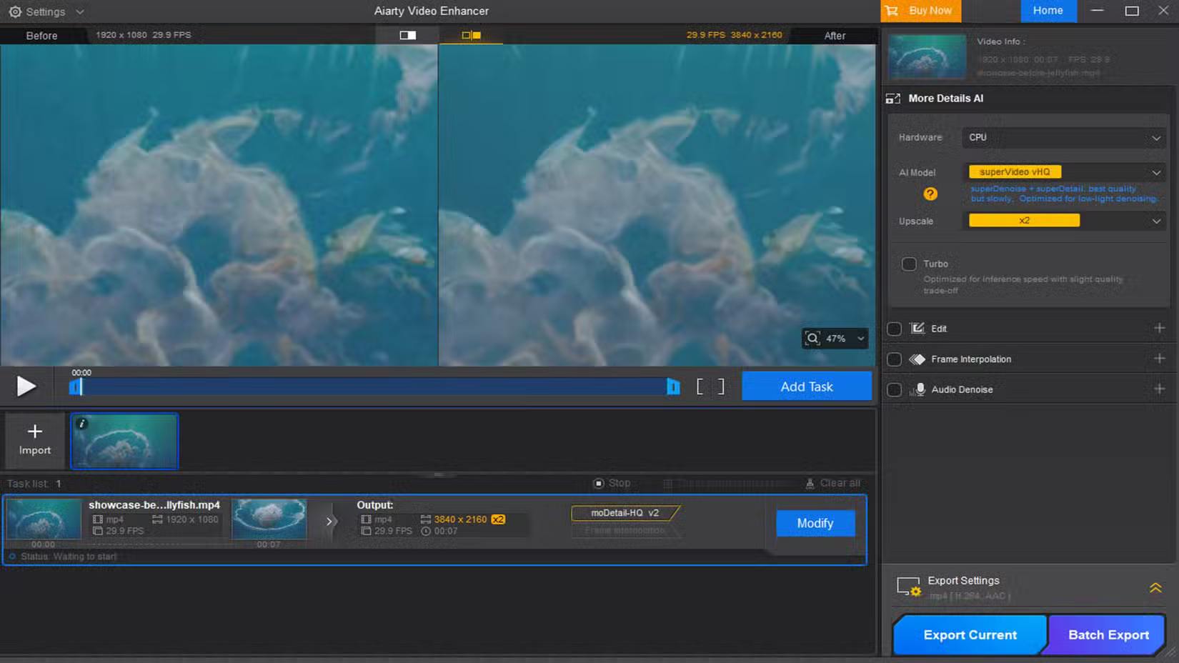 Nhiều chương trình chỉnh sửa gây khó khăn cho người mới bắt đầu. Aiarty tránh được điều này bằng cách bố trí mọi thứ rõ ràng, đơn giản. Sau khi cài đặt phần mềm, người dùng kéo file video vào, chọn 1 trong 3 chế độ AI (moDetail-HQ v2, SuperVideo vHQ hoặc Smooth-HQ v2) và đặt độ phân giải đầu ra.