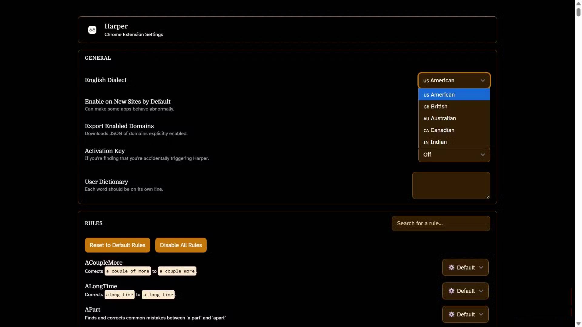 Trong cài đặt tiện ích mở rộng, bạn sẽ tìm thấy các tùy chọn cho phương ngữ - tiếng Anh Mỹ, Anh, Canada, Úc hoặc Ấn Độ - đảm bảo công cụ phù hợp với những quy ước ngôn ngữ của bạn. Tính năng từ điển địa phương rất hữu ích cho các từ vựng chuyên ngành: Thuật ngữ kỹ thuật, tên thương hiệu, danh từ riêng hoặc các thuật ngữ chuyên ngành mà những từ điển tiêu chuẩn không nhận ra. Nếu bạn thêm một từ một lần, Harper sẽ ghi nhớ nó vĩnh viễn mà không cần đồng bộ với bất kỳ dịch vụ đám mây nào.