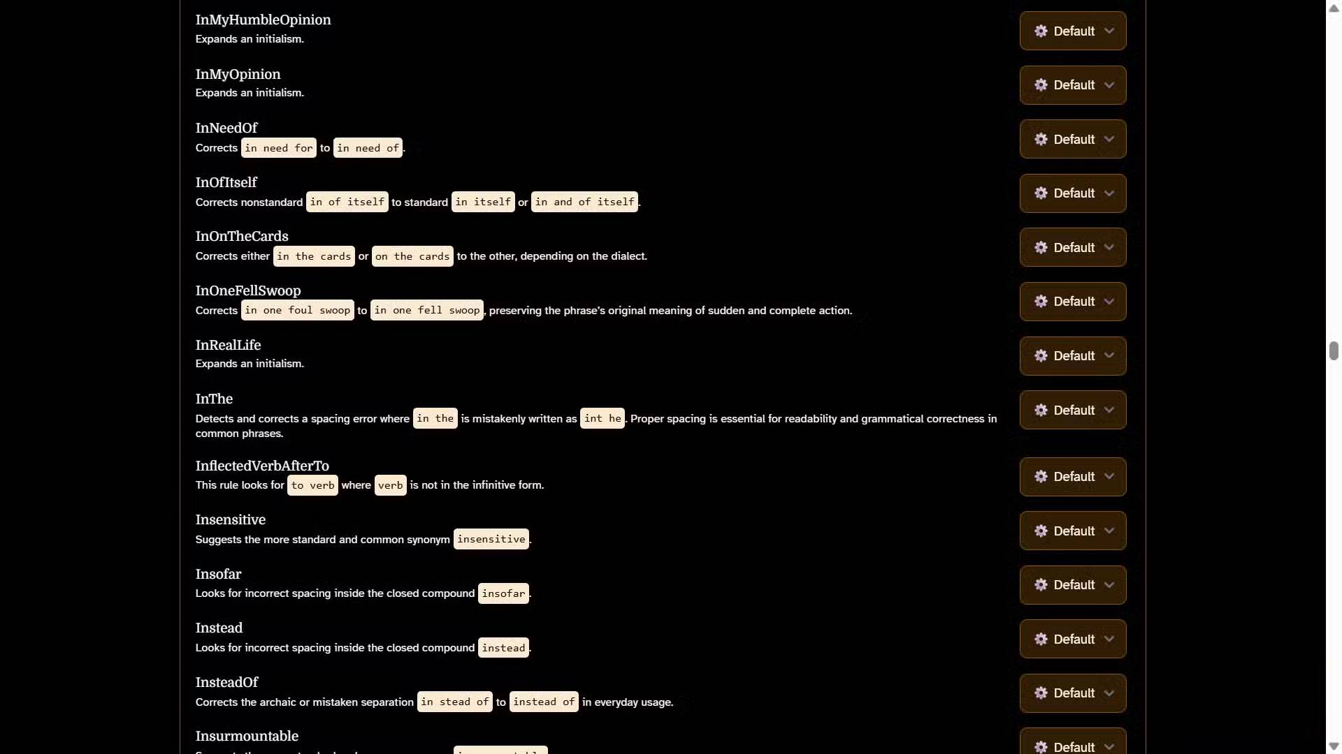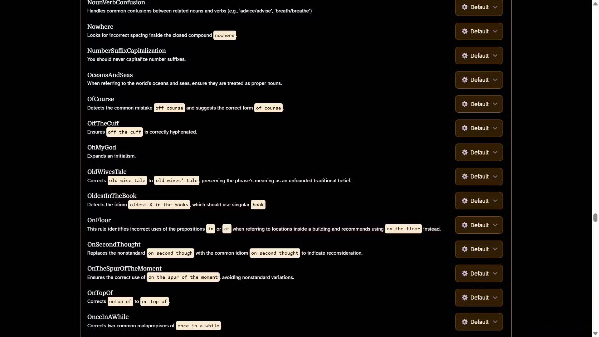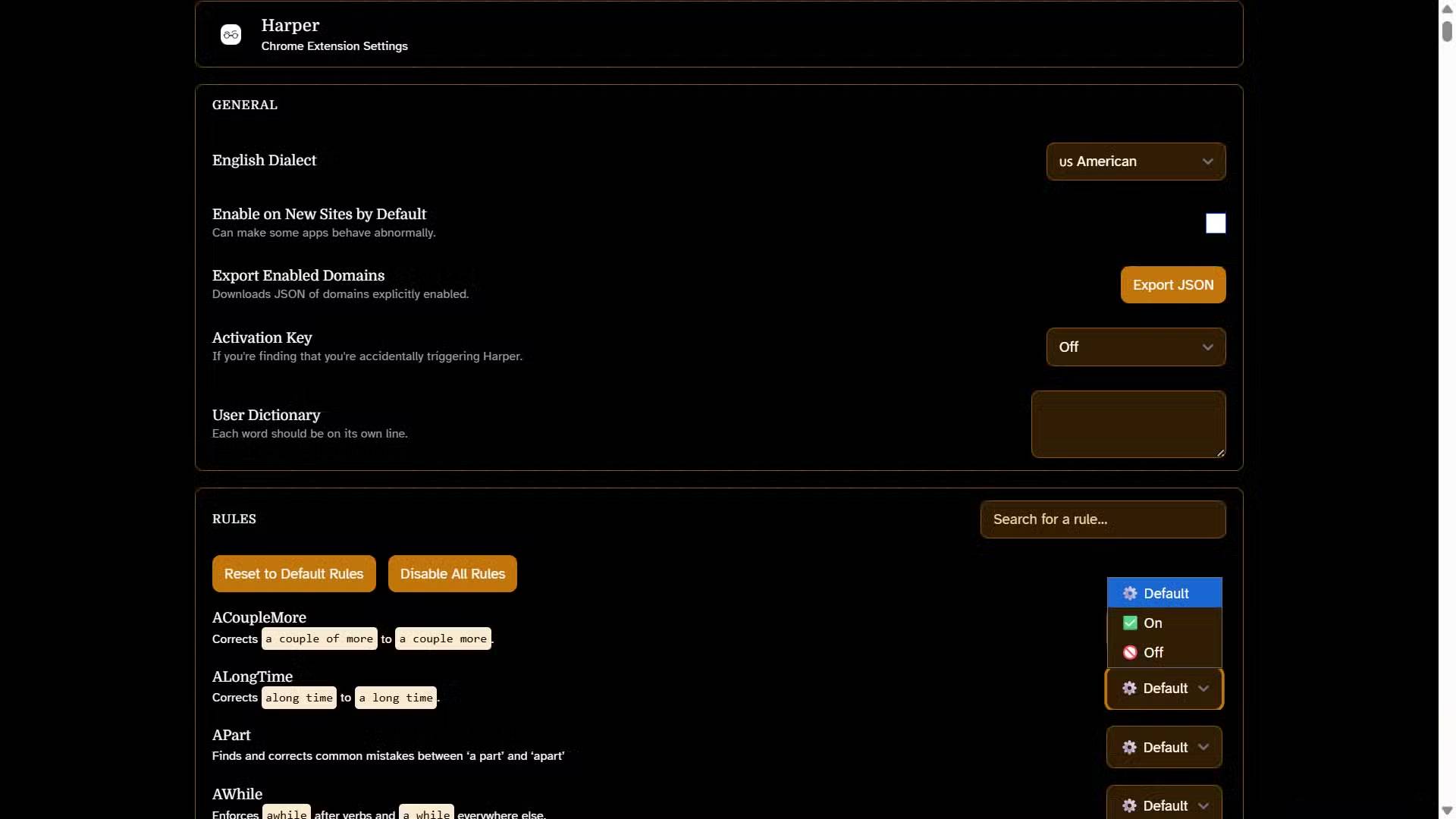 Hệ thống quy tắc minh bạch và có thể tìm kiếm. Chức năng phát hiện lỗi của Harper dựa trên một danh sách quy tắc toàn diện giúp xác định các vấn đề như lỗi khoảng cách, lỗi dấu câu, từ lặp lại và những vấn đề ngữ pháp phổ biến. Mặc dù hiện tại bạn không thể thêm các quy tắc tùy chỉnh, nhưng bạn có thể duyệt qua bộ quy tắc hiện có để hiểu chính xác những gì Harper đang tìm kiếm. Nếu bạn muốn tắt một quy tắc cụ thể không phù hợp với phong cách viết của mình, hãy nhấp vào menu drop-down bên cạnh bất kỳ quy tắc nào và chọn Off.