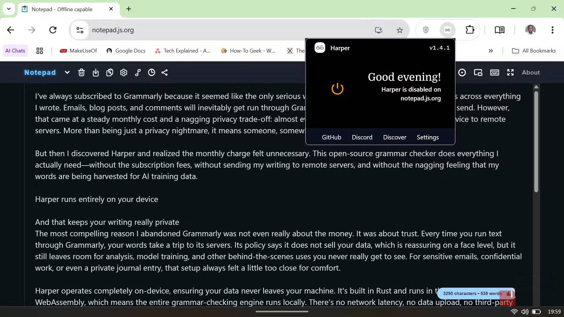Nhưng rồi mọi người phát hiện ra Harper và nhận ra rằng khoản phí hàng tháng là không cần thiết. Công cụ kiểm tra ngữ pháp mã nguồn mở này làm mọi thứ bạn thực sự cần mà không phải trả phí đăng ký, không gửi bài viết của bạn đến các máy chủ từ xa và không có cảm giác khó chịu rằng từ ngữ của mình đang bị thu thập để làm dữ liệu huấn luyện AI.